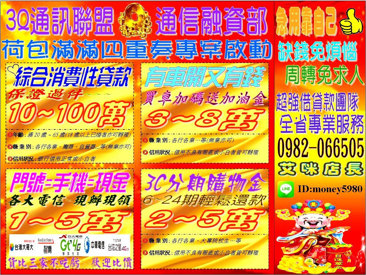 辦門號手機換現金~小額借錢周轉貸款=台中 彰化 南投 苗栗 桃園 中壢 新竹 台北 基隆 雲林 嘉義 台南 高雄 =3Q通訊聯盟&通信融資部門