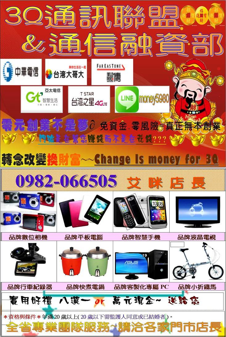 3Q通訊聯盟&通信融資部門~本公司政府立案有實體店面已開業8年=大台中市 大台北市 大桃園市 新竹縣市 雲林縣市 嘉義縣市 大台南市 大高雄市 成立北.中.南通訊大聯盟連鎖系統店(全省服務)